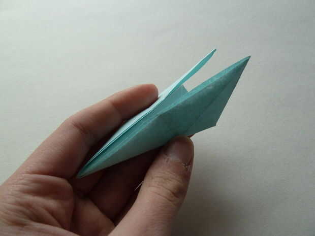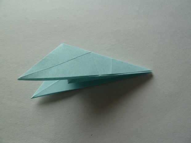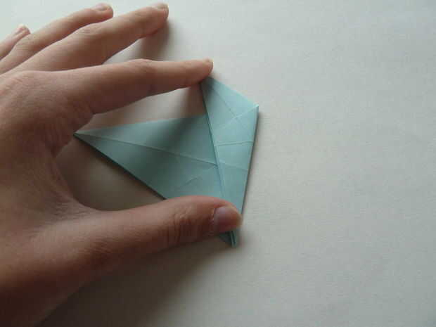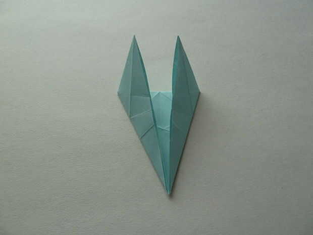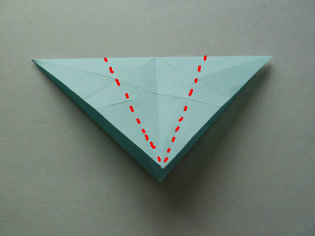 Dobla el papel por la mitad en uno de los pliegues diagonales. Lleve las esquinas izquierda y derecha doblando los pliegues marcados en la primera foto. Para completar el plegado, doble el papel por la mitad con el lado 'abierto' hacia arriba como se muestra.