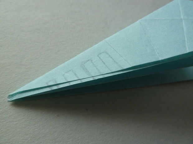 En la pieza doblada, se puede ver un pequeño pliegue, marcado en la imagen, así. Cada parte de esta línea hasta el punto puede utilizarse para dibujar su diseño en. Si se dibuja en el lado abierto del triángulo (uno con más capas visibles), su diseño será en el centro del ala. Si se dibuja en el lado cerrado del triángulo, su diseño será en los exteriores del ala.