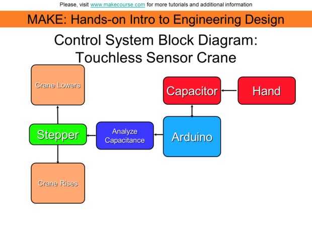 Aquí vemos el diagrama de bloques de función. La mano forma un condensador con el papel de aluminio: efectivamente, almacenar una carga de la señal de Arduino a la lámina. El Arduino mide el tiempo que tarda el capacitor en cargarse. Arduino utiliza esta información e inicia el motor paso a paso en cualquier dirección por consiguiente.