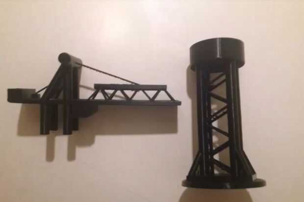 La grúa se desarrolla en dos partes: la base y mástil y la horca y la torre. Cada parte fue tomado cuidado encajan bien (con el agujero e introducir diferencias de una décima de pulgada). La grúa se utiliza para un número de libras, dependiendo del material con que se imprime. Las horca parte diapositivas ajustadas en el mástil para fijación simple. .Stl pueden encontrarse archivos adjunto.