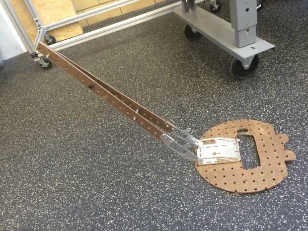 Marque el contorno de la Roomba en tu hoja de madera perforada. Esta cortado con una sierra de cinta y terminarlo por lo que se ve mejor con una sierra de calar y una lijadora de banda. Mantener el exceso de madera para el brazo de la grúa. Corte el exceso de madera en dos 1 pulgada por las tiras de 18 pulgadas. Éstos forman las dos partes del brazo.
