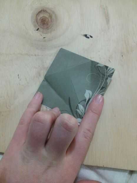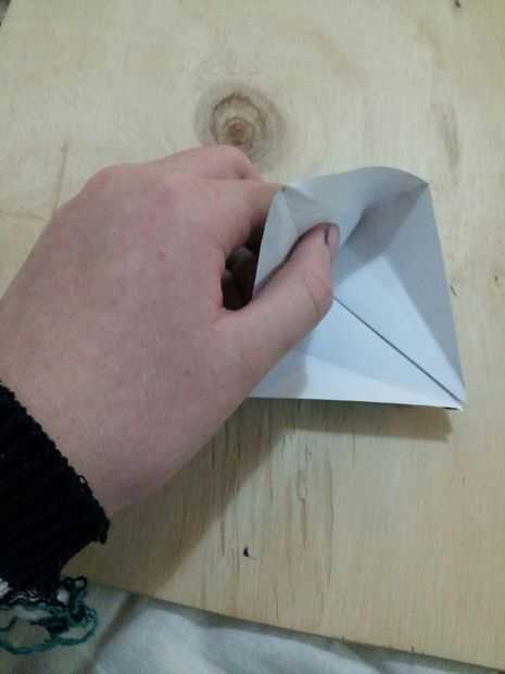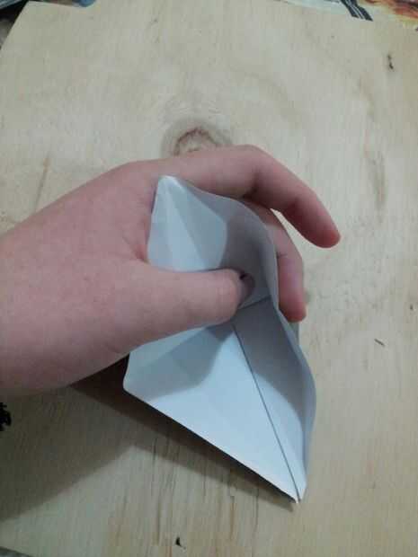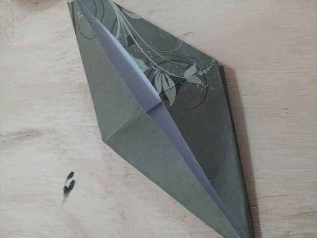 Abrir las dos aletas de un lado y abrir el triángulo. doble los lados así que cumplen con el pliegue central. Hacer esto para ambos lados.