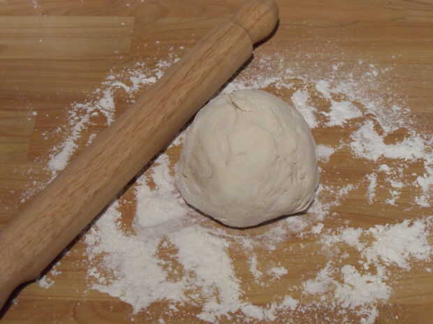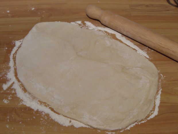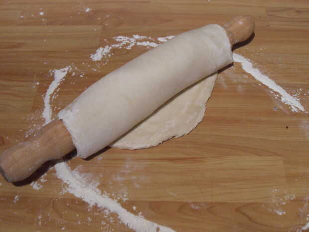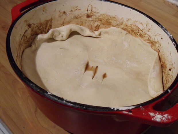 Estirar la masa sobre una superficie enharinada y luego enrollar sobre un perno de balanceo y desenrollarlo luego en la parte superior del relleno de empanada. Usted podría conseguir lejos con usar un poco menos de lo 500g que utilizo como que le da una corteza gruesa agradable pero es una cantidad conveniente como que es cuánto viene en un paquete.