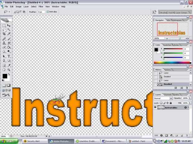 Bien, ahora que usted tiene su fuente y su estilo de capa en la fuente, podemos empezar el efecto real sí mismo. Seleccione la herramienta lazo (no su lazo poligonal, no su lazo magnético, sólo su lazo!) Ahora acercarse a la lona un poco (Ctrl-+) tomar su lazo a donde usted quiere hacer que la letra se vea deteriorado y en un pequeño pequeño rincón en la carta, sólo spaz hacia fuera! Hacer garabatos poco apretados todo muy cerca (sin soltar el lazo.) entonces puedes borrar esa zona. (Véase el cuadro para más detalles). Ahora estás acabado! Por supuesto, este efecto sólo se ve bien en como grunge tipo cosas, pero por lo menos sabes hacerlo ahora. Además, hay algunos ejemplos aquí para mirar también.