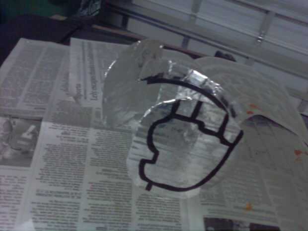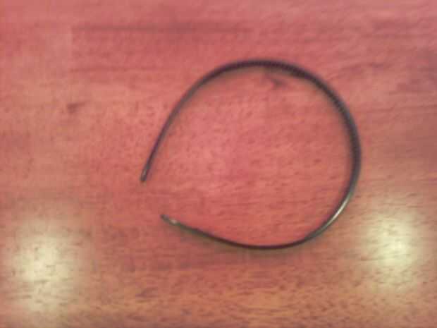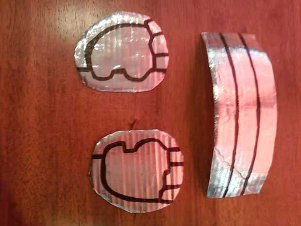 Corte de cartón y cubierta de cinta de metal. Detalles con marcador negro. Antiguo con pintura negra, dejar secar. Colocar piezas a la diadema con cinta de metal más.