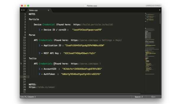 - Credencial del dispositivo (aquí: https://build.particle.io/build) ID de dispositivo (aka coreID)