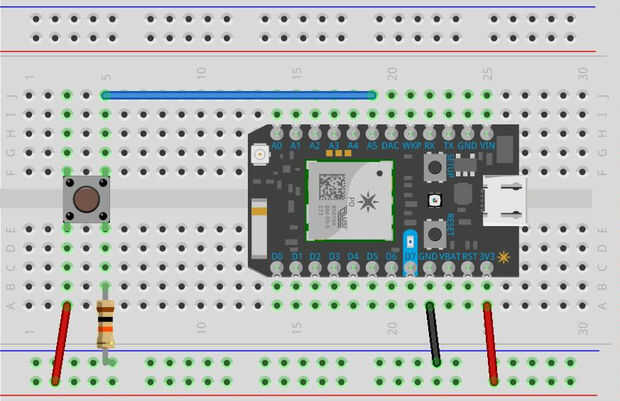 Pop tu partícula fotón (w/cabeceras), botón y resistencia en el protoboard como se muestra en la imagen. Coloque los cables del puente como se muestra. Encender con el cable micro del USB conectado al ordenador.