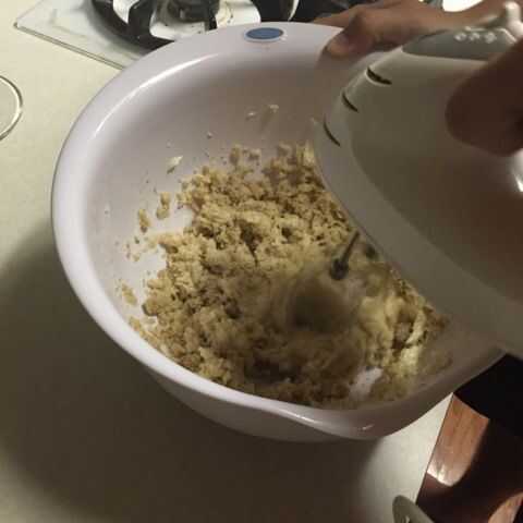 Con la mano batidora batir la mantequilla, el extracción de azúcar granulada, azúcar morena y la vainilla en el tazón de la batidora grande hasta que esté cremosa como se muestra en la segunda foto.