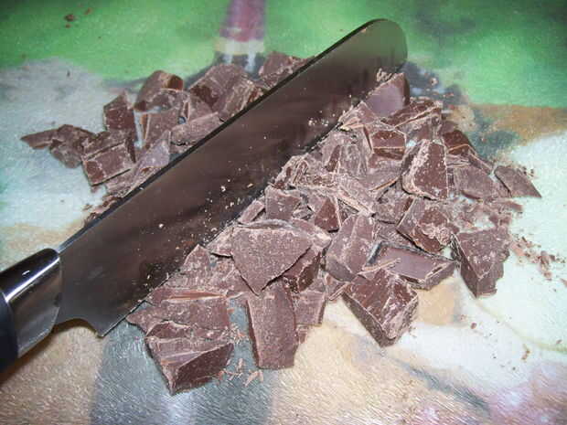Si tu chocolate es en forma de bloque, más o menos pique. Si está en pedazos, no hay para romper más. Medir el volumen de tu chocolate unmelted. Desea que el aproximadamente el mismo volumen de unmelted piezas de chocolate como hacer chips. Por ejemplo, para 2 taza virutas, use 2 taza, chocolate unmelted. (Usé la mitad de 24. paquete onzas.)