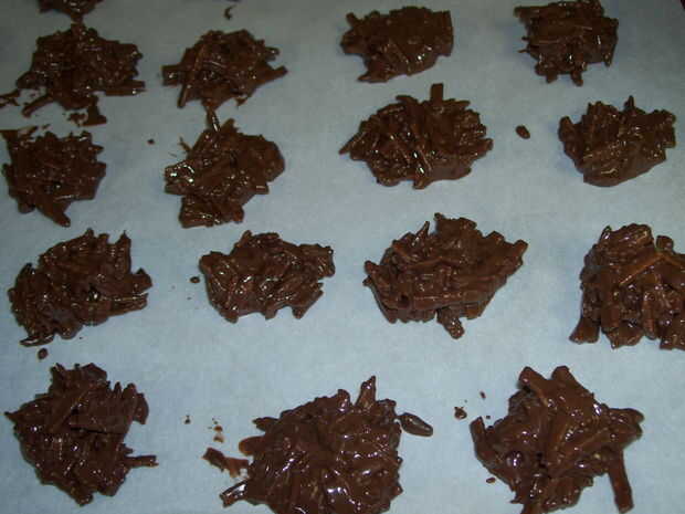 Dejar caer por cucharadas sobre papel pergamino y permiten establecer. Consumir. Almacenar en un recipiente hermético alejado del calor.