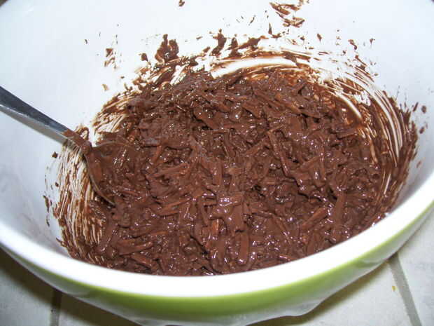 Vierta el chocolate derretido sobre las fichas y revuelva para cubrir. La cantidad de chocolate necesaria puede ser subjetiva. Si encuentras que no tienes suficiente, añadir más chocolate derretido.