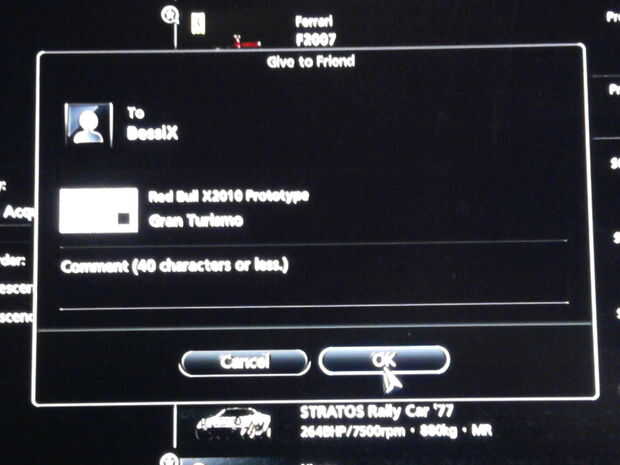 En este paso te voy a mostrar cómo enviar el coche a un amigo. 1. ejecutar GT5 2. ir a 'Garage' 3. triángulo pres en el coche que quieres enviar a un amigo 4. Seleccione 'Dar a un amigo' 5. Seleccione al amigo que le gustaria tener el coche 6. tu coche se ha ido