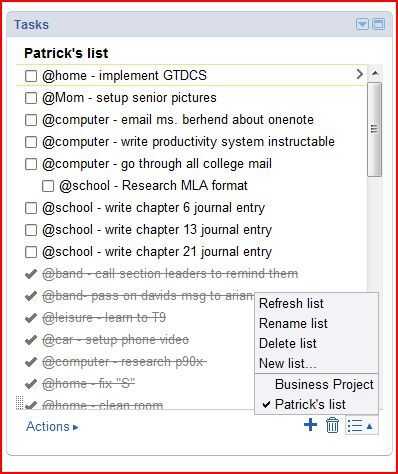 así que ahora tienes lugares para poner cosas. una lista de acciones, una lista de proyectos y archivos de cosas extras. Aquí es donde los contextos vienen tan útiles. Además de mi moleskine, uso el widget de tareas de google en mi página de iGoogle para realizar un seguimiento de mis próximas actuaciones y proyectos. tienen contextos medios acaba de poner u o frente a las tareas. esta manera, se hace lo que hay que hacer cuando estoy en la computadora, y cuando estoy en la biblioteca, se hace materia. bastante simple