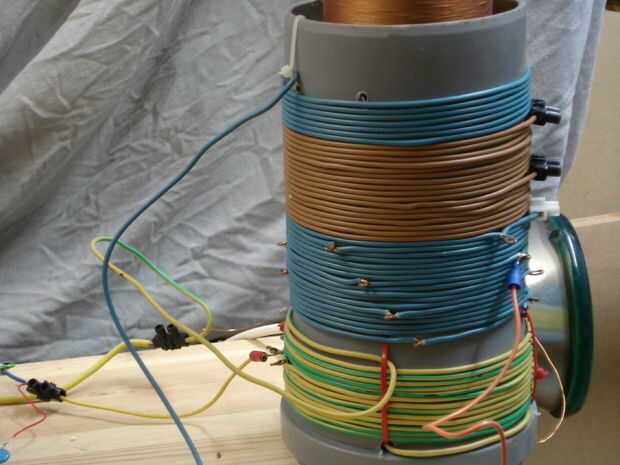 Esto no es divertido en absoluto. Me tomó alrededor de 5 horas para hacer todas las tres bobinas. La primaria y la bobina de regeneración tienen grifos para el ajuste fácil. Recuerde que el número de vueltas secundarios no afecta directamente la tensión de salida. Utilicé hilo 0,5 mm para el secundario (0.25 m m también está bien) y alambre de 2 mm para la primaria y la bobina de FB. Después he terminado el secundario me puse algunos sprayshellac claro la bobina para mantener todo en su lugar.