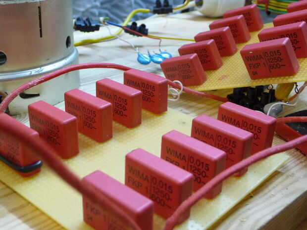 La mejor manera son condensadores de pomo pero son bastante caros por lo que decidí utilizar 20 condensadores de la película. En el paso 10 calcula 750pF para mi GU-81 VTTC usé 1, condensadores de 5nF (1250V) en serie. De esta manera sólo pagué 5€.