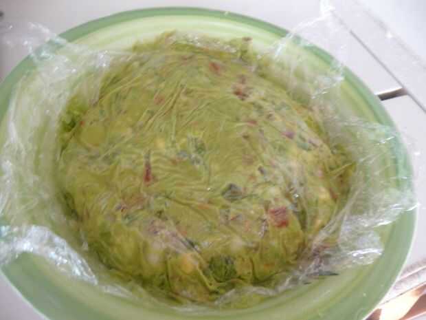 Use una espátula al montículo el guacamole en un recipiente de vidrio limpio. Cubrir toda la superficie del guacamole con envoltura transparente y refrigere durante una hora o así. Esto da los sabores puedan mezclarse y desarrollar.