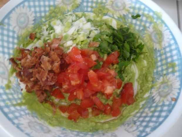 A continuación, incorpore los tomates, cebollas verdes, cilantro y la mayoría de los crumbles de tocino. Reservamos un par cucharadas de bacon para decorar.