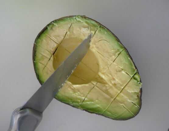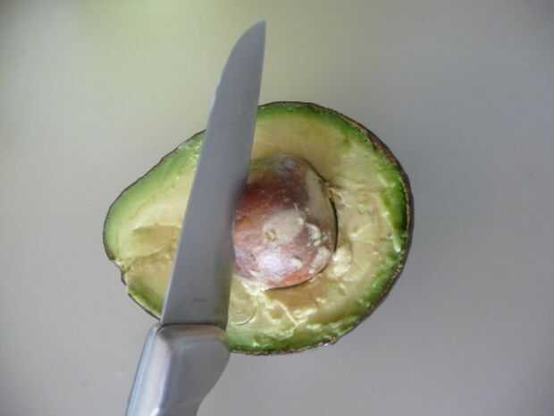 Cortar los aguacates por la mitad con un cuchillo pequeño. Girar aparte. Rápidamente (y con cuidado) rap la hoja en la semilla. Torcer el cuchillo y sáquelo.