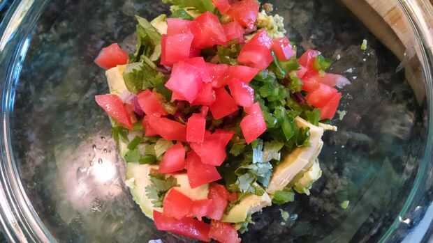 Siguiente dados encima de la cebolla, jalapeños, tomates, cilantro y agrega a la palta.
