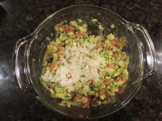 Con su cuchillo, cortar la mitad de la cebolla en trozos pequeños. Mezclar en un tazón grande con tomates y aguacates.