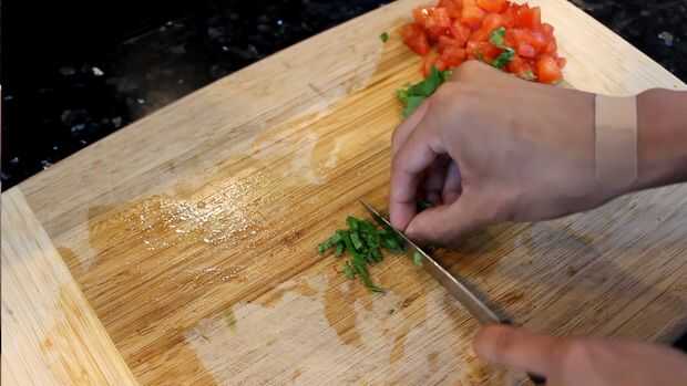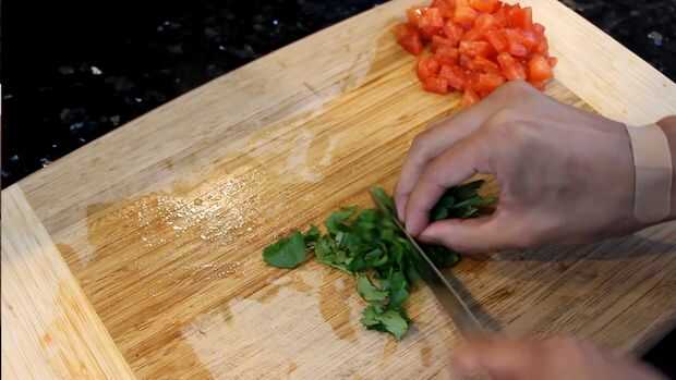 Apartar el tomate y haz tu cilantro. Cortar los tallos del cilantro y picamos. Ahora, su menta y córtela en fina Juliana. Al mismo tiempo mezclar los tres ingredientes frescos.