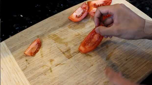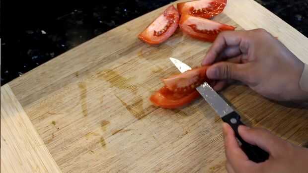 Cortar el tomate en cuartos longitudinalmente. Asegúrese de cortar el tallo. Ahora, usando su cuchillo, corta bien el centro de cada rebanada entre la carne exterior del tomate y la porción de líquido/de la semilla (debe ser como filetear un pescado). Esencialmente, estamos destripar el interior de los tomates y retirar todos los líquidos y semillas. No queremos que los líquidos porque hacen nuestro guac demasiado que moquea y facilitar la descomposición. Ahora, sólo picar tus piezas de tomate en trozos pequeños.