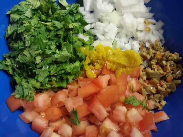Después de cortar la cebolla y tomates y picado perifollo, Cilantro, aceitunas y pimiento plátano añadir el ajo y poner todos los ingredientes juntos en un tazón...