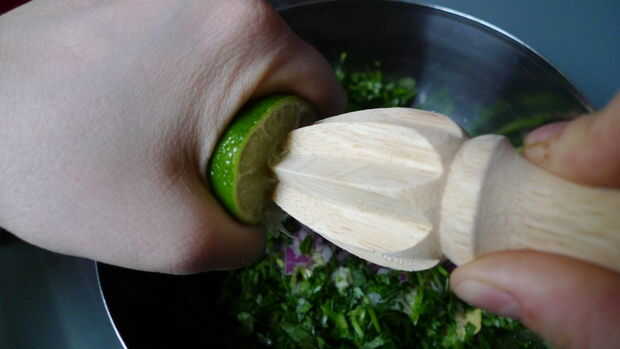 Usar un exprimidor o las manos para exprimir el jugo de una mitad de cal en la mezcla.