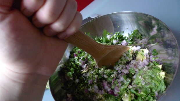 Utilice su espátula de madera para triturar el aguacate y poco a poco comienzan a incorporar la cebolla, ajo, limón, sal y pimienta. Sólo un poco el puré de guacamole fornido.