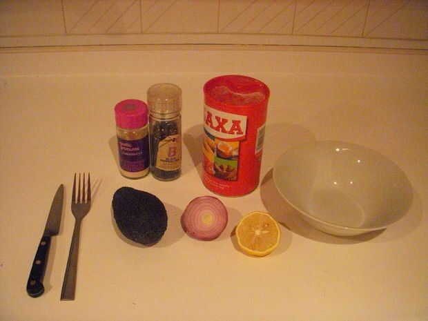 (Sólo una nota - yo rara vez uso recetas, razón por la cual yo no he dado cantidades específicas aquí. Como una guía aproximada, utilizo un aguacate pequeño, un cuarto de una cebolla, una rodaja de limón y una cucharadita de ajo en polvo si estoy haciendo esto por mí mismo, y pueden comer esa cantidad en una sentada como un snack)
