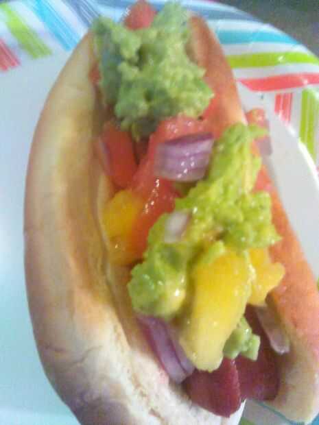 El perro caliente en el pan tostado y cuchara de Guacamole y Pico De Gallo en el perro caliente y disfrutar!