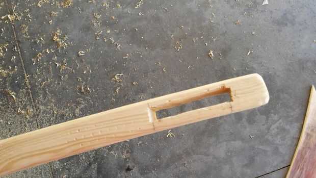 Use una sierra de calar, Sierra de contornear, Sierra de marquetería, o lo que funciona para quitar el material entre los dos agujeros. Luego utilice un pequeño cincel y escofina si es necesario de limpiar para arriba.