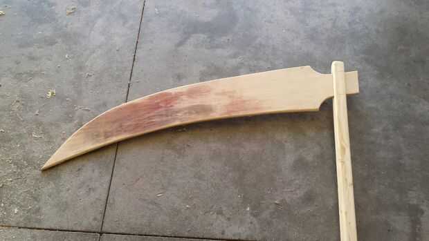 Usted puede hacer su guadaña como usted quiere. Donde vivo, no pude encontrar ningún 2 "x 2" más de 8 pies. Y ya que nuestro actor Grimm Reaper será 8 pies de altura (sobre pilotes), tuve que empalmar lo 2 "x 2" con el otro para ampliar una