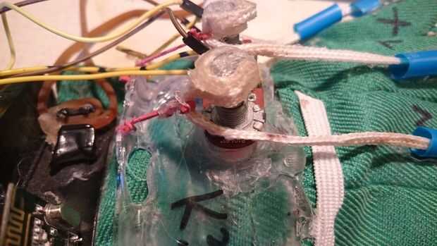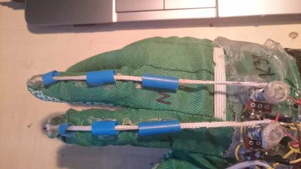 Segunda imagen muestra cómo están conectados los cables, como se puede ver el otro extremo de la cuerda se pega en la parte superior de dedo, tendrás que pasar un buen rato ajustando estas longitudes