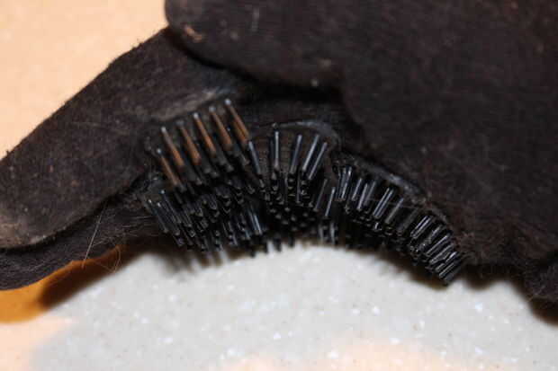 Una vez seco el Plasti Dip, colóquese los guantes y la flexión de la mano. Verifique que las escobillas son seguras y que pueden cerrar parcialmente la mano. Si es necesario algún ajuste, está bien para sacar los cepillos y volver a pegarlos. Plasti Dip se adhieren muy bien a sí mismo.