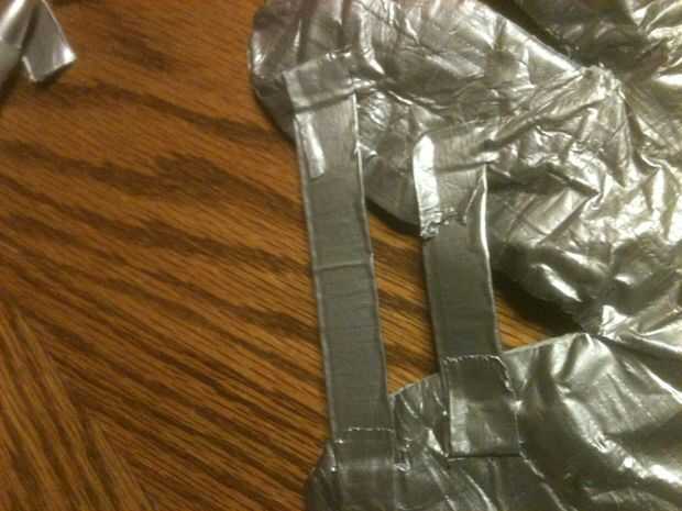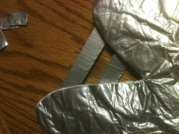 bien, por lo que deben tener conducto de cinta todo por ahora, zapatos de la cinta del conducto, calcetines, guantes, bolsos del ordenador portátil, chaquetas, todo. Pero una cosa no tiene, es una máscara de la cinta de conducto. La última parte de l