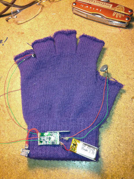 Luego puse mis piezas en el guante para ver cuál es la mejor para arreglarlos. Quería que el altavoz en mi pulgar y el micrófono en mi dedo meñique. La batería y circuitos y el cargador, decidí poner en la parte posterior de la muñeca como pensé que sería menos de la manera allí. El botón que quería tener en el medio de mi palm por lo que podría golpear con mis dedos cuando fui por que se encrespa en la posición talk.
