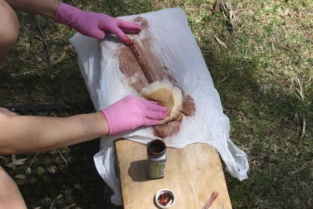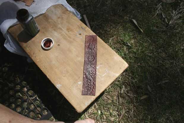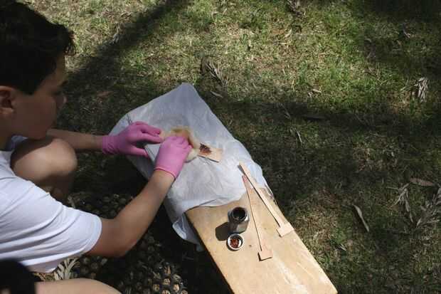 Nota:, usar guantes y superficie de la cubierta cuando la coloración, es muy difícil de bajar cuando seca. Guantes de color rosa son no una necesidad para este paso, cualquier color puede usarse :-)