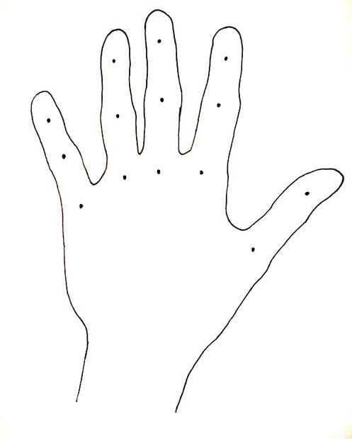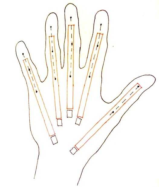 Línea de los recortes de tela en cada dedo de guante que se centran en el conjunto de marcas. Nos coloca mis recortes, que no cubren la articulación distal de cada dedo (también conocido como el empalme tercer que es el más cercano a tu uña del dedo). Lo hicimos porque queríamos capturar la flexión de las dos primeras articulaciones de cada dedo, puesto que la mayoría de la gente no puede controlar voluntariamente su tercera unión de todos modos.