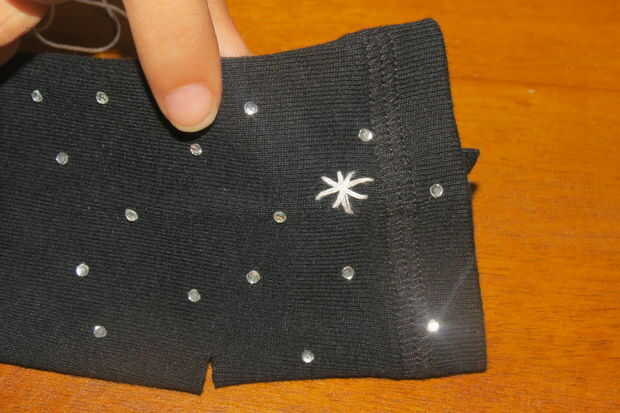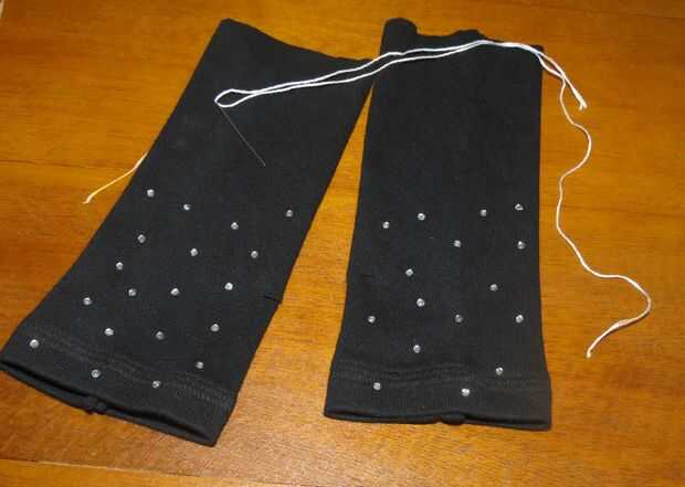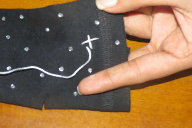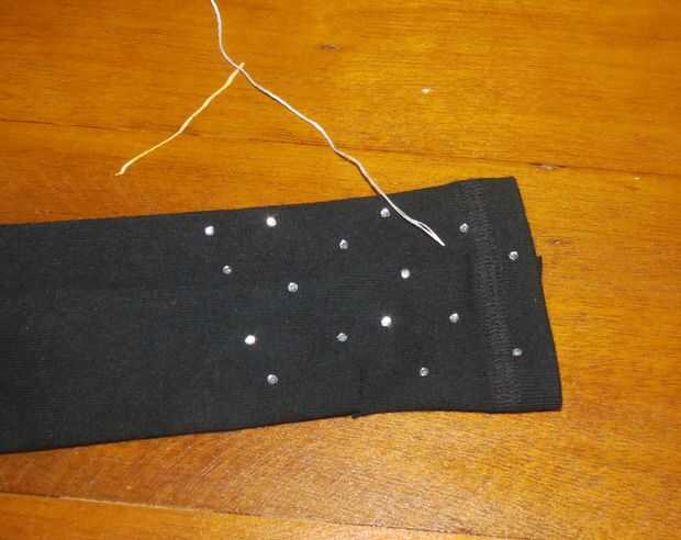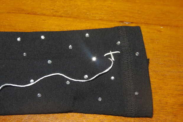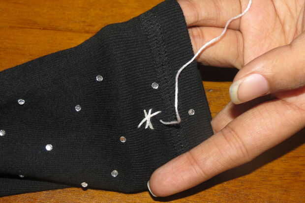 Enhebre la aguja y comience a coser estrellas en puntadas largas. Yo he cosido 3 estrellas en cada guante, puede coser muchos como usted desea.