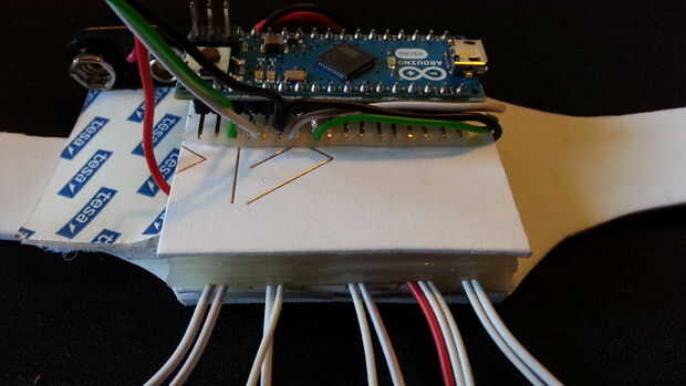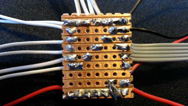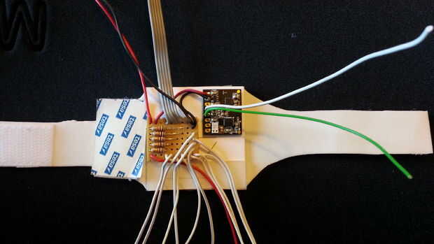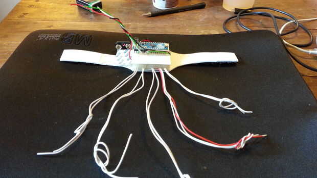 Corte 10 pedazos de alambre que debe ser lo suficientemente largos para ir de su muñeca a la punta de los dedos (cables blancos en la imagen). Te recomiendo para que sea más largo (35 cm) para que usted puede cortarlas a lo largo buena luego cuando vamos a crear los dispositivos de toque de dedos. La soldadura esta los cables como se muestra en la imagen.