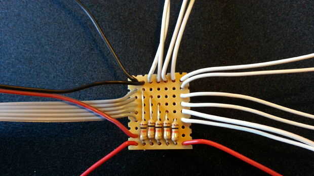Arriba se muestra la tabla de resistencias. Los cables blancos hacen la conexión desde la punta de los dedos y tocar los dispositivos. El negro cables son Gnd y los rojos los 5V. Los cinco cables cable plano gris se conectarán a los pines de Arduino A0 a A4. Nota: no necesitamos el cable rojo superior en la parte inferior izquierda de la Junta en la primera imagen.