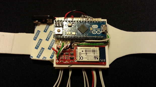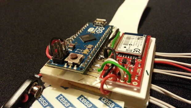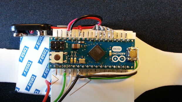 Por desgracia, el micro de Arduino no está disponible sin los pernos de la placa. A cierta altura y fijar el Arduino en la pulsera, doblé los pernos como se muestra en la imagen 1. La mejor manera de hacerlo es doblando cada pin uno por uno con una pinza de nariz pequeña. Tenga cuidado de no romper el perno. Una vez que se dobla cada perno 90 ° podemos empezar a soldar los cables como sigue: