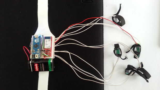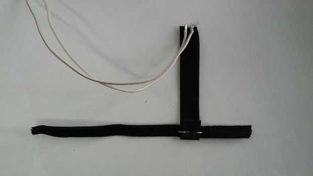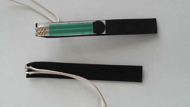 Cortar la espuma de PVC en rectángulo de 9 x 90 mm. pegar la resistencia con la delgada cinta de doble cara como se muestra en la imagen 1. Doble suavemente los pernos de la resistencia de dos para que usted puede soldar los cables provenientes de la pulsera en el lado opuesto como se muestra en la imagen 2. Antes de realmente soldar los cables, hay que cortarlos a la longitud adecuada. Así que conecte la pulsera a la muñeca y estimar la longitud del par de alambre (dos por dedo) para cada dedo. Tenga cuidado, usted necesitará ser capaz de formar un puño y doblar la muñeca hacia abajo. Aquí es un recordatorio de qué cable va con qué dedo. A0: índice, A1: dedo medio, A2: anillo de dedo, A3: pinky, A4: pulgar.