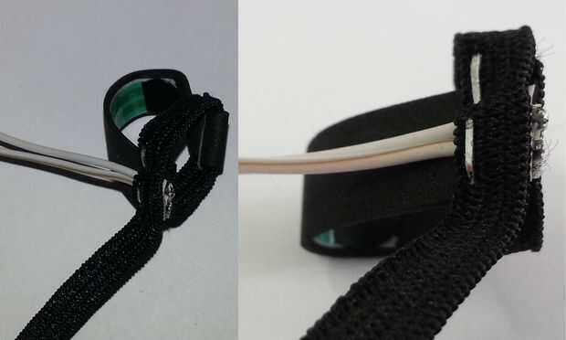 Corte de 60mm de la cinta elástica y adjuntarlo a la banda de PVC con una grapadora como en la imagen 2. La banda de espuma de PVC se dobla alrededor de la venda de elástico. Esto significa que la grapadora se va en 3 capas (PVC - elástico - PVC).