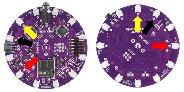 1. De la parte inferior del tablero, inserte el cable de servo en pernos de Lilypad (ver imagen). El cable rojo debe ir en el 3.3V pin, el cable negro en el conector de tierra (GND) y el cable amarillo en el primer pasador de gatillo (T1).