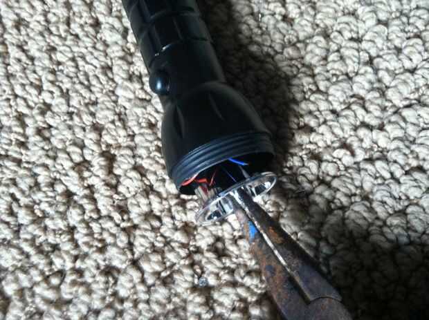 Ok así que ahora todo lo que tienes herramientas que necesitamos para disecar la linterna. Desenroscar la parte superior y tire hacia afuera la luz con las pinzas (no se rompen los hilos que salen de la luz) luego saca lo tubo plata para que sólo tienen los focos de luz. Si todavía se conectan los cables a la luz, pegamento pegamento caliente en su lugar si están desconectados soldarlos en y luego caliente.
