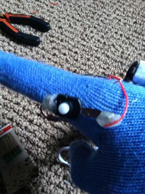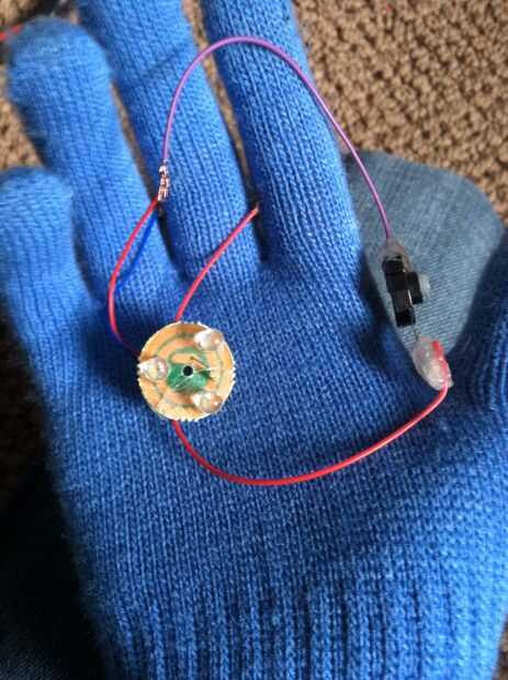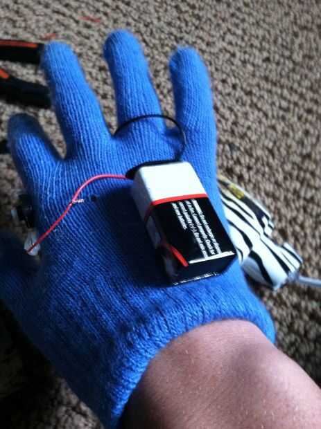 Ahora aquí en esta parte es donde tienes que elegir. Podrias poner esto en una camisa como un reactor de arco o ponerlo en un guante. Fui con un guante. Ahora poner en su guante y poner todo donde quieras para ver cómo se ve (no pegar nada aún). Si usted tiene un montón de cables colgando por todas partes clip ellos y re elctronico. Ahora pégalo en el lugar. La batería en primer lugar causarla el pegamento es el más pesado entonces pegamento el botón me puso justo al lado de mi primer dedo. Ahora pegue la luz justo en el centro de su palma.