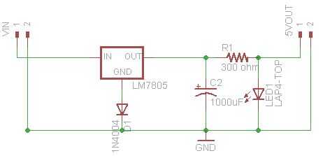La figura muestra el esquema de un circuito de regulador de voltaje de 5 voltios. El IC utilizado aquí es el LM7805 5 voltios, regulador de voltaje de 3 pin. Se trata de una energía baja, IC de bajo costo.