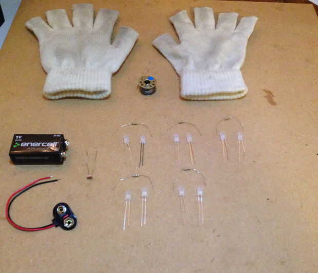 Tenía LEDs de 5 mm blanco en la mano, así que utiliza 10 para un guante. Como cada LED tiene la resistencia adecuada, (más o menos) puede añadir tantas como quieras.